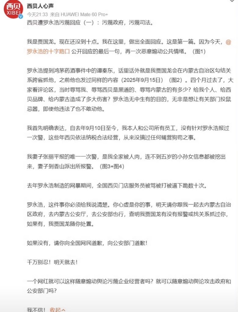 我是贾国龙。现在还没到十点。我在这里,做出全面回应。这是第一篇。因为今天,罗永浩的十字路口 公开回应的最后一句,再一次恶意煽动公共情绪。(图1)